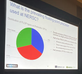 Notice that whereas FP64 and FP64 Tensor dominate the overall floating-point precision on Perlmutter GPUs, FP32 usage is about 36% of the total. This report surprises me because the broad domain of simulation-based HPC applications still seem to be heavily based on FP64. The presenter points out that about half of the FP64 floating-point precision is Tensor based, but no other precisions use Tensor Cores.