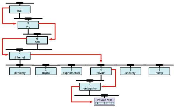 The Simple Network Management Protocol (SNMP) was developed and standardized for monitoring and controlling network components. A Management Information Base (MIB) reveals the details of information that can be queried. This tree-like structure (Figure 1) stores all of the retrievable properties, and each property is accessible via an object identifier (OID).