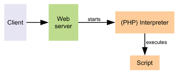 Web servers are pretty dumb when left to their own devices. All they can do is serve up files and thus deliver static content. To create a web page dynamically, they need the help of another web server program – such as the PHP interpreter. The PHP interpreter then runs one or more (PHP) scripts that, ultimately, build the page. The method web servers use to call the interpreter and return the completed page was specified in a 1993 standard, the Common Gateway Interface, or CGI for short. As soon as the web server receives a request, it sets a few environmental variables and then starts the interpreter. The interpreter in turn evaluates the environmental variables from, and returns the generated web page to, the web server via standard output (Figure 1).