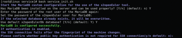 Next, you need to initialize x2openEuler itself. Within your terminal session, move to /usr/local/x2openEuler/portal/service/ and get started using the script service_init.sh. You will be asked a number of questions regarding your setup (Figure 1); feel free to use common-sense answers.