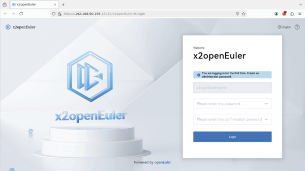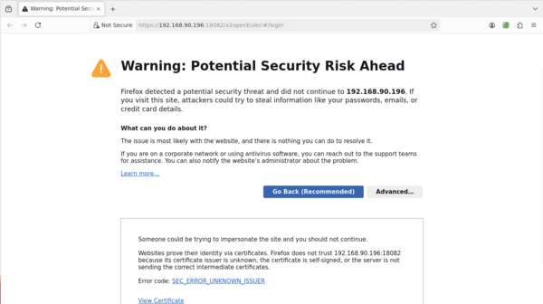 The initialization script will perform a number of tasks in order to enable and launch the service, including the generation of a self-signed TLS certificate for x2openEuler's web interface. At the end of the process, the server will be running, and you will be able to access the web interface by pointing a web browser to https://$yourserver:18082/x2openEuler/#/login (where $yourserver is the machine's IP address). Because x2openEuler uses a self-signed certificate, you should expect your web browser to throw a warning (Figure 2) before it lets you access the web interface (Figure 3).