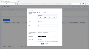 Within the task creation section, you may add as many target servers as you like. You may either add them in a batch by uploading a Microsoft Excel file (a template file is provided) or you can add servers one by one. x2openEuler will manage the target servers over an SSH connection, and both password- and keyfile-based authentication are supported (Figure 5).