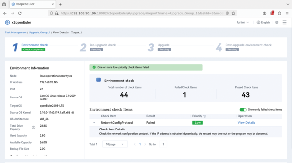 Figure 6: The detailed status for one of the servers: This migration task shows a minor failure because x2openEuler thinks this server might be using a dynamic IP address.