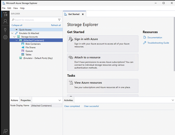 ASE offers several options for connecting to Azure Storage in the Get Started tab with Attach to a resource links (Figure 1): with an Entra ID login, a connection key, a SAS, or direct URI access. When connecting to a storage account with a connection key, you can view and copy the key directly in Access keys on the Azure portal. If you use Entra ID to log in, make sure the appropriate data roles, such as Storage Blob Data Contributor or Storage Queue Data Reader, are assigned; otherwise, many operations will remain grayed out or throw errors.
