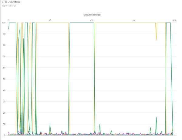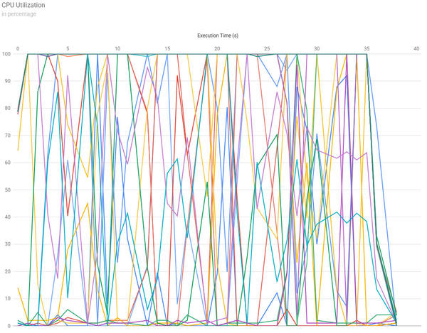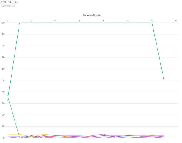Before I ran the code, I modified the environment variable to change the resolution of data gathering from every 10 seconds to every 1 second, which results in a great deal more data that however helps with interpreting the results. The first chart is CPU utilization (Figure 1).
