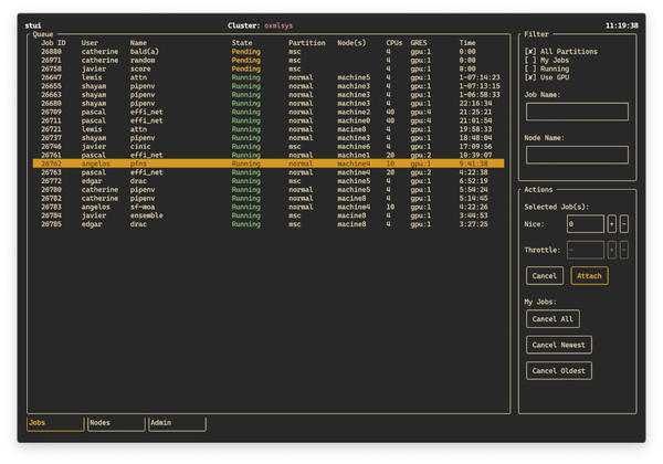 Slurm is likely the most popular resource manager (job scheduler) in HPC. It is also heavily used in AI. Although the use of Slurm is straightforward, you might have to use several commands along with some filtering and processing to get a view of what you want. For HPC users, this can be a problem when all you want to do is run your application without the need or desire to learn the details of Slurm. An easy-to-use solution is stui , a Slurm dashboard for the terminal. This TUI application monitors the Slurm resource manager (Figure 3).