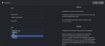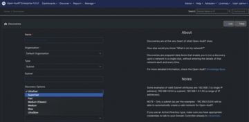 Credentials alone are useless if you cannot also use them as part of a discovery or audit process. At the end of the day, Open-AudIT is essentially about identifying devices on a network and serving up information on them. With Discover | Discoveries | Create Discoveries , you can define different types of network scans. A scan covers a single IP address, an IP range, or an IP subnet.
