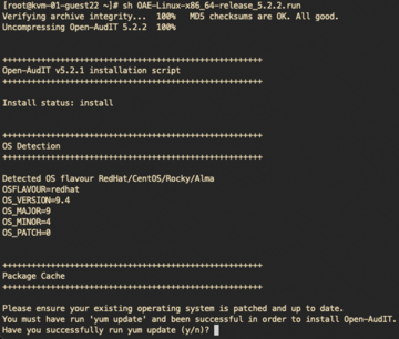 The setup installs and configures a MariaDB database and an Apache web server. Apache will be responsible later for storing all the details of your IT assets. Both the database and the username for the installer is openaudit . The user password is displayed on the screen during the installation and is also included in the documentation.