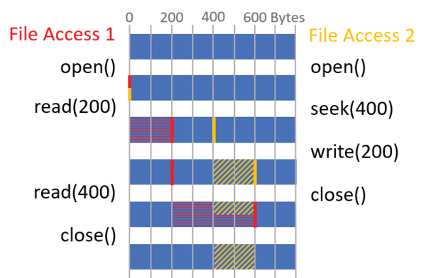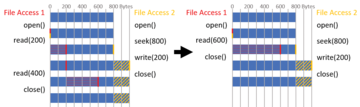However, if a write call from another file access occurs on the file, you need to consider the byte area affected by the calls. Figure 3 shows a second read call of the first file access reading the bytes written by another file access that occurs after the first read call, which prevents simply merging the second call into the first because it would change the read result.