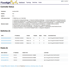 Figure 3: The Floodlight GUI visualizes all the critical information for the OpenFlow network. You can view switch states, the network topology, and the connected devices.