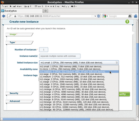Figure 9: Eucalyptus gives you a choice between different virtual machines with different hardware models.