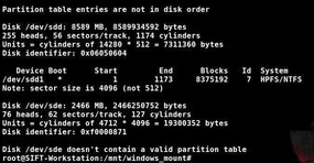 Figure 7: Results after running fdisk -l notice the HPFS/NTFS system at /dev/sdd1. This result is after login to the pmem location.
