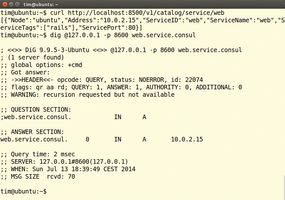Figure 4: The two commands retrieve information about the web service. The first command uses the HTTP interface, the second the built-in DNS server from the Consul server.