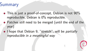 Figure 4: The project is still experimental, but 90 percent of the Debian packages can already be built reproducibly. (Slide by Holger Levsen [2])
