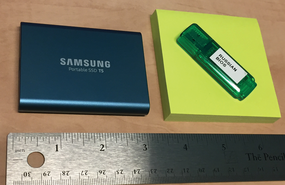 Figure 1: Samsung Portable SSD T5, 500GB, with a Post-it note block and USB key for scale.