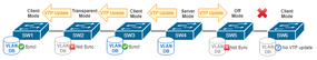 Figure 2: SW1 to SW6 are in the same VTP domain but have different VTP operational modes.