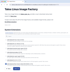 Figure 3: The Talos Image Factory lets you build customized images of the distribution, which can also contain additional components such as the commercial NVIDIA drivers.