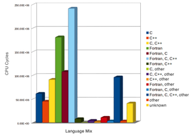 Why these languages? Because they have been generating very efficient code for a long time. Figure 1 shows statistics for languages used on the SuperMUC system in the first half of 2017 (see the box titled “SuperMUC”). Column lengths in the figure are proportional to the number of CPU cycles assigned to the projects. Because many projects use a mixture of languages (only 32 percent of all cycles belong to projects that use only one language), these mixtures are represented as separate categories. Fortran is involved in about 72 percent of all allocated project resources, with 54 percent C++ and 41 percent C.