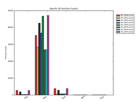 Figure 1: I/O function count for all input files for (from left to right on the x-axis) read, write, lseek, open, and close. (Figure 2 from the MPI strace Analyzer report)
