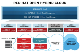 Figure 1: Red Hat's cloud architecture aims to integrate both its own cloud technologies, RHEV-M and OpenStack, and third-party cloud technologies with the help of its Delta Cloud API.