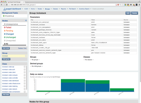 Figure 3: The Puppet Dashboard with an overview of the important configuration parameters of the kickstack group and the participating nodes.