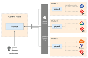 Figure 2: The PipeCD architecture is clearly laid out; the central components are the control plane comprising MySQL and redis, the PipeCD daemon, and piped instances that execute workloads. © PipeCD/ASL 2.0