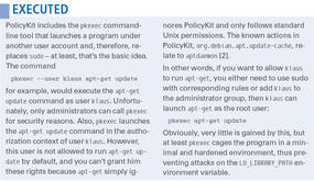 However, even if an application supports PolicyKit, it doesn’t need to respect its instructions; thus, an attacker can easily work around PolicyKit with malicious code. More useful facts about PolicyKit are also to be found in the “PolicyKit Workshop” article [1].