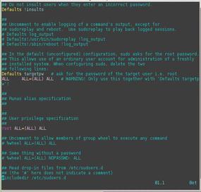 # Redefine environmental variables: Defaults env_reset Defaults secure_path="/usr/local/sbin:/usr/local/bin:/usr/sbin:/usr/bin:/sbin:/bin" # Permit access: root ALL=(ALL:ALL) ALL %admin ALL=(ALL) ALL %sudo ALL=(ALL:ALL) ALL # Add more rules here: #includedir /etc/sudoers.d
